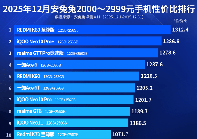 最后,在2025年12月份安兔兔2000—2999元手机性价比排行榜中,iQOO Neo10 Pro和realme GT8分列第七名和第八名。在安兔兔平台上,这两款智能手机的性价比评分分别为1201.7分和1189.7分。在此之后,iQOO Neo11和Redmi K70至尊版分列第九名和第十名。在安兔兔平台上,这两款智能手机的性价比评分分别为1186.5分和1071.7分。其中,影像方面,小米Redmi K70至尊版手机搭载了5000万像素超级动态主摄加持的三摄系统,主摄采用1/1.56英寸索尼IMX906传感器,单像素尺寸1.0μm。